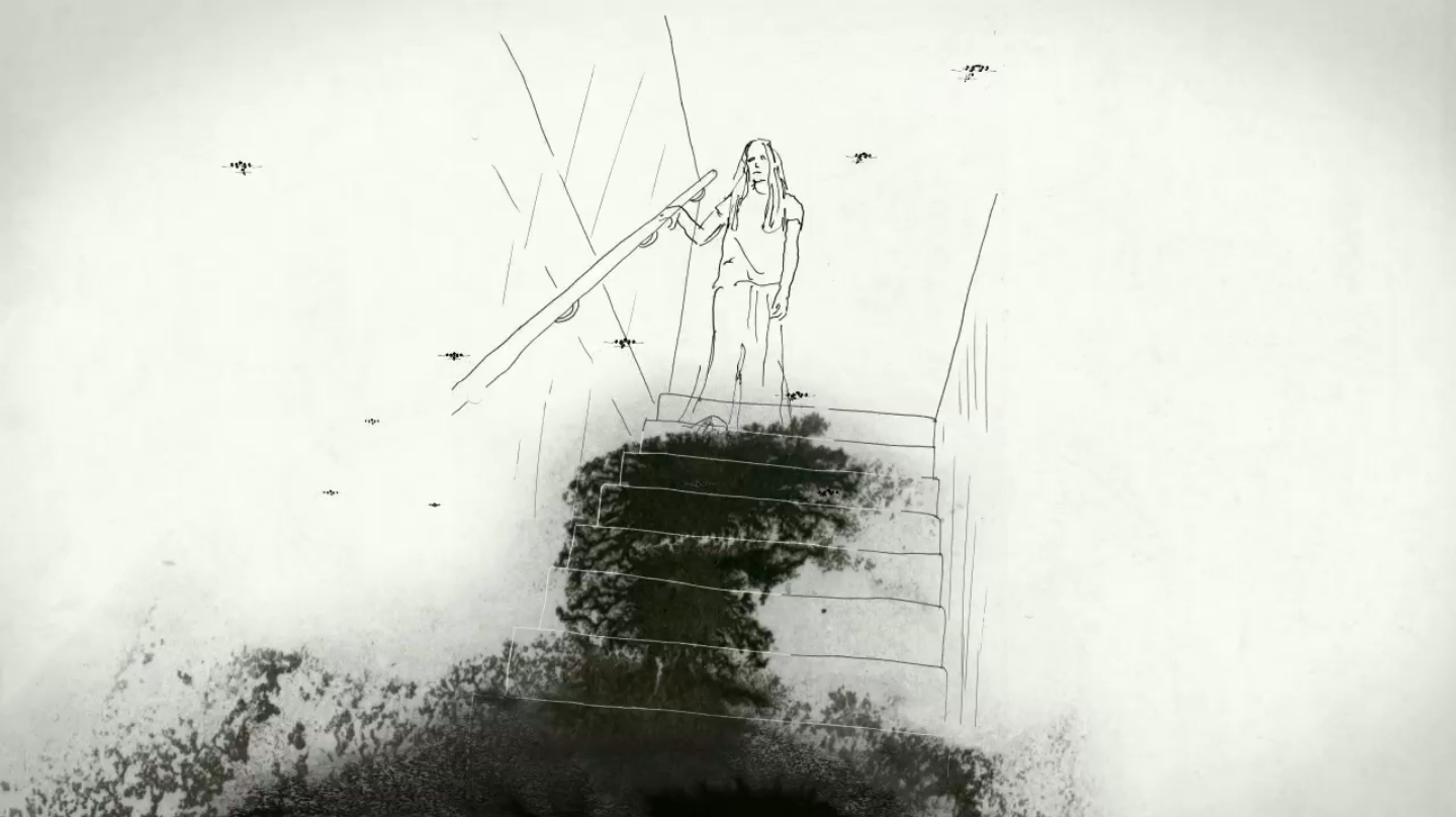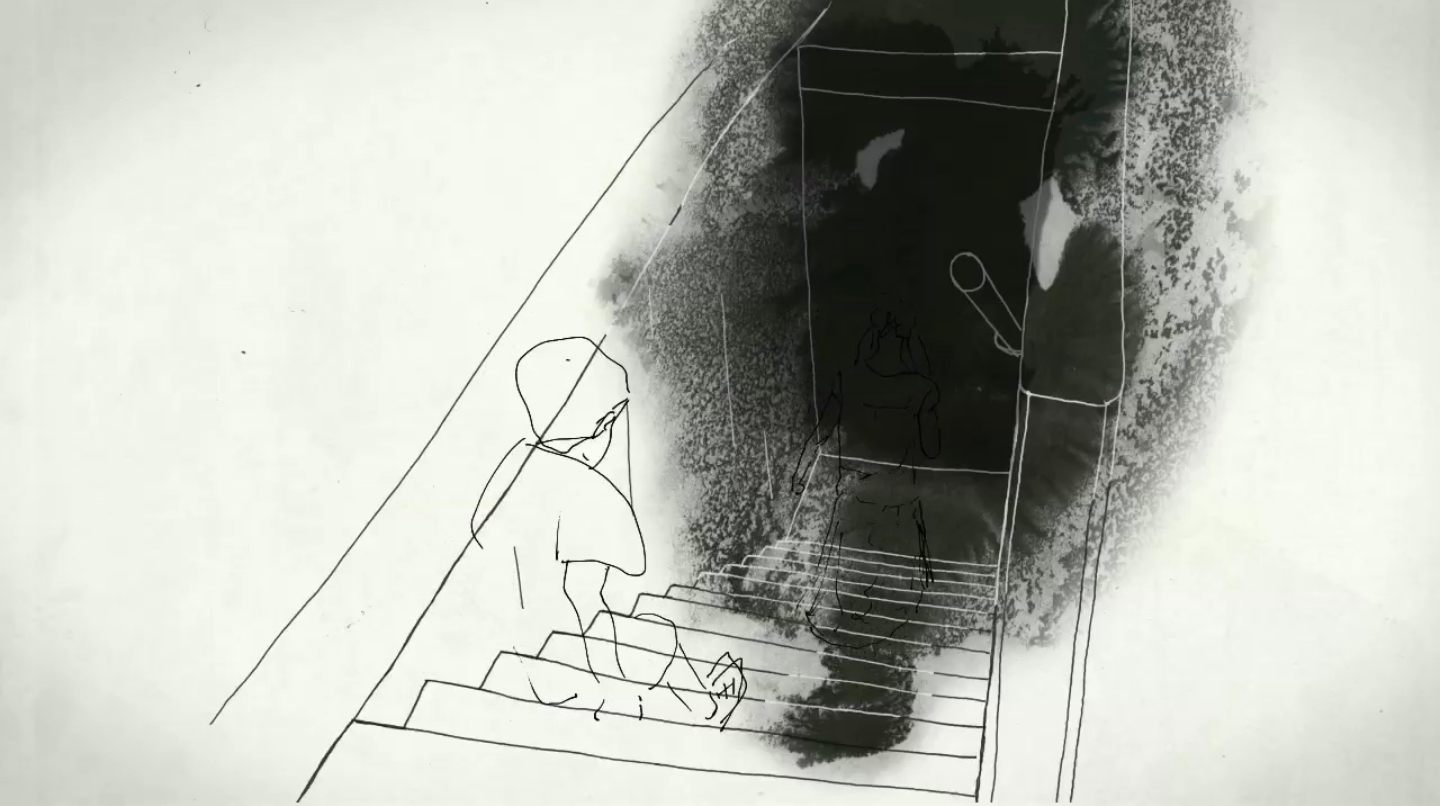 Schomburg captures the visual essence of memory through the use of transparency, a sepia colour palette and floating camera movements that include slightly conflicting uses of perspective. While much of the composition is left abstracted by splashed ink, these textures provide context for individual details to pop out. Recognition is owed to the director for crafting the feeling that we are experiencing the narrator’s minds eye.