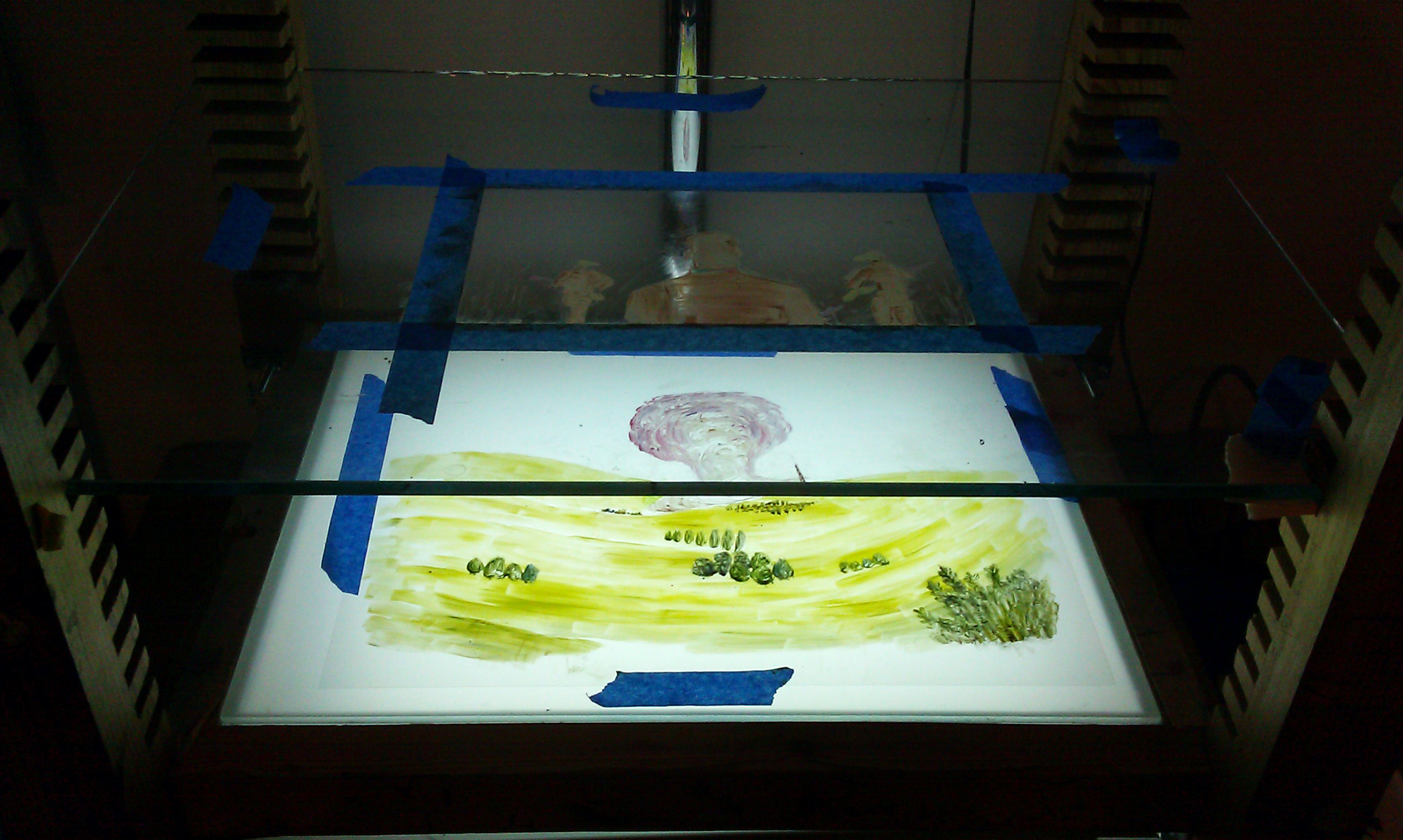 After the storyboard then I started testing with the paint, asking ‘what can the paint do? Is the paint better for detailed close ups or rough smudgy imprecise drawings?’ You also see a lot of texture, so there are a couple of scenes where the paint fills the screen or the paint is being erased, and that’s just fun to do. Then I started animating and I completed about half of it before I moved to the Netherlands, but I didn’t have my same multi-plane stand here, so I had to figure out how to deal with that.