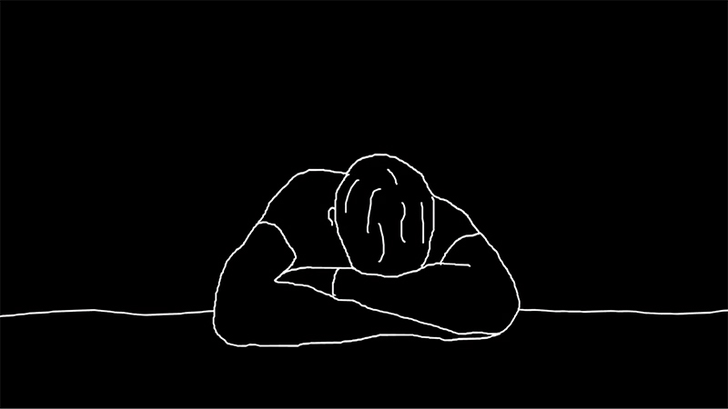 WM: I was inspired to use the white stroke on black style by an animator I met in 2014 called Viviane Vollack. She joined my class at Uni and delivered a presentation in that style, and ever since I found it much more captivating than the standard black stroke on white background. The white really pierces your eyes and stands out more than black in my opinion. The colour and also the animation concept of breathing text in and out came from a drawing I did not long before production of the film began. I liked the link between breathing in and out, and receiving and giving speech. There’s a delivery-and-response aspect to both. The colour was designed to be a real contrast from the rest of the piece, particularly defining important foreground and background elements. For example, the red and white of the Michael Jackson BAD poster helped capture its constant presence on my left wall as I do physio every day. I often watch or listen to MJ during that time.