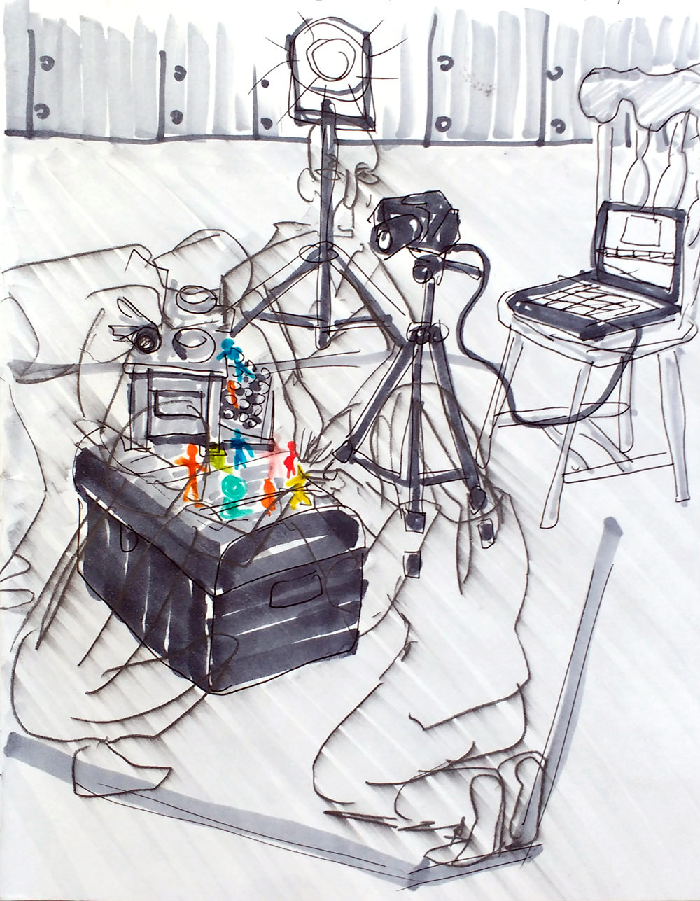 Each workshop participant was instructed to make a miniature version of themselves out of colourful lumps of Newplast Modelling Material. The 11 tiny figures shared the limelight in a claymation ensemble within the short film which gradually emerged. In between frames we participants huddled around the set, incrementally adjusting our respective putty avatars.
