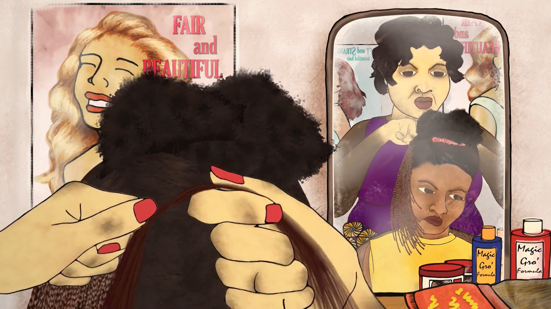 ‘I believe skin and the body are often distorted into a topographical division between reality and illusion. The idea of beauty has become globalised, creating homogenous aspirations and distorting people’s self-image across the planet. In my film, I focus on African women’s self-image, through memories and interviews, using mixed media to describe this almost schizophrenic [sic] self-visualisation that I and many others have grown up with.’ (via)