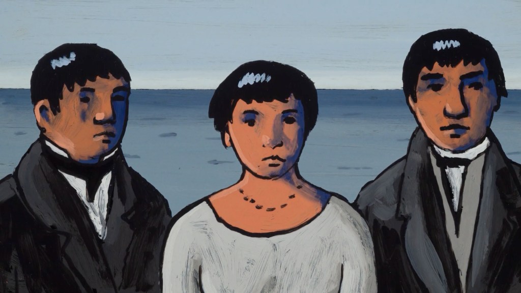 Darwin’s Notebook (Georges Schwizgebel, 2020) delves into Charles Darwin’s notebook from 1833. He was aboard the Beagle as the ship travelled to return three kidnapped indigenous Alakaluf people of Tierra del Fuego to their home country. The film flows beautifully from one image to the next, with a painterly style combined with impressive, cinematic camera moves. The film follows the kidnapped people, from their previous life in their homeland through their violent abduction and attempts to replace their own culture with contemporaneous European ideals. When they are returned to their home they are adorned with the clothes and materials of the ‘civilised’ world, but these are soon abandoned. The film ends with a title card stating that the Alakaluf people were ultimately destroyed by western disease, persecution, and the deprivation of their natural resources.