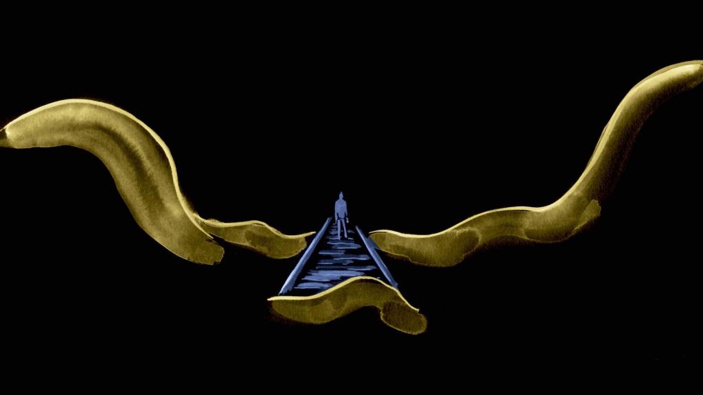 The Train Driver (Zuniel Kim, Christian Wittmoser, 2021) examines the psychological impact on a train driver of the six suicides of strangers that he has been caught up in through his job. Simple blue and yellow tinted sequences develop against a black background, offering an elegant counterpoint to the narrator’s words and allowing the audience to focus on the sensitive story he is telling.